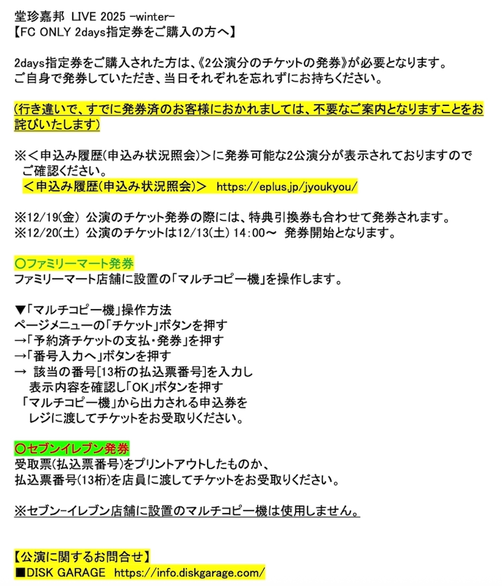 【FC ONLY 2days指定券をご購入の方へ】堂珍嘉邦 LIVE 2025 -winter- 発券状況について